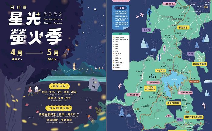 春夜最浪漫的光景來了!日月潭國家風景區管理處宣布「2026日月潭星光螢火季」正式登場,活動自4月起一路延續至5月31日,結合生態導覽、原民文化與低碳旅遊,邀請旅客走進山林與潭畔,在星空與螢光交織的夜晚,感受大自然的療癒魅力。