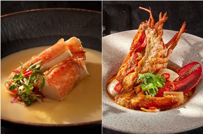 主廚團隊介紹,海鮮檯網羅澎湖蝦蛄、松葉蟹腳、鮑魚、馬祖淡菜及澎湖小卷等食材,並設有現烹區供應「新加坡辣醬龍蝦」、「花雕蒸帝王蟹腳」等熱食。鐵板檯與爐烤檯則提供「鹽昆布燒鮑魚」、「和牛臀上蓋」、「馬沙拉烤羊腿」等異國風味料理。熱饗區包含「響螺佛跳牆」、「松露鴨肝蒸蛋」、「紅酒燉和牛頰」與「和牛壽喜燒」等菜式。
