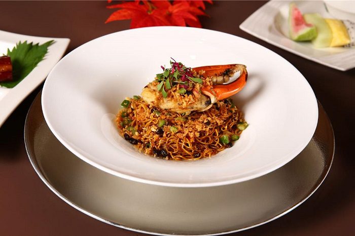 套餐以「柚香海膽醋凍蟹」揭開序幕,清蒸沙公蟹螯搭配日本馬糞海膽與柚子果醋凍,酸香開胃;主食「蟹鉗風沙廣炒麵」以避風塘炒蟹鉗鋪於蟹膏廣式炒麵上,鑊氣十足;「蟹香田園灼時蔬」則以蟹膏、鹹蛋黃與花雕酒炒製蟹粉醬燉煮時蔬,濃郁可口。